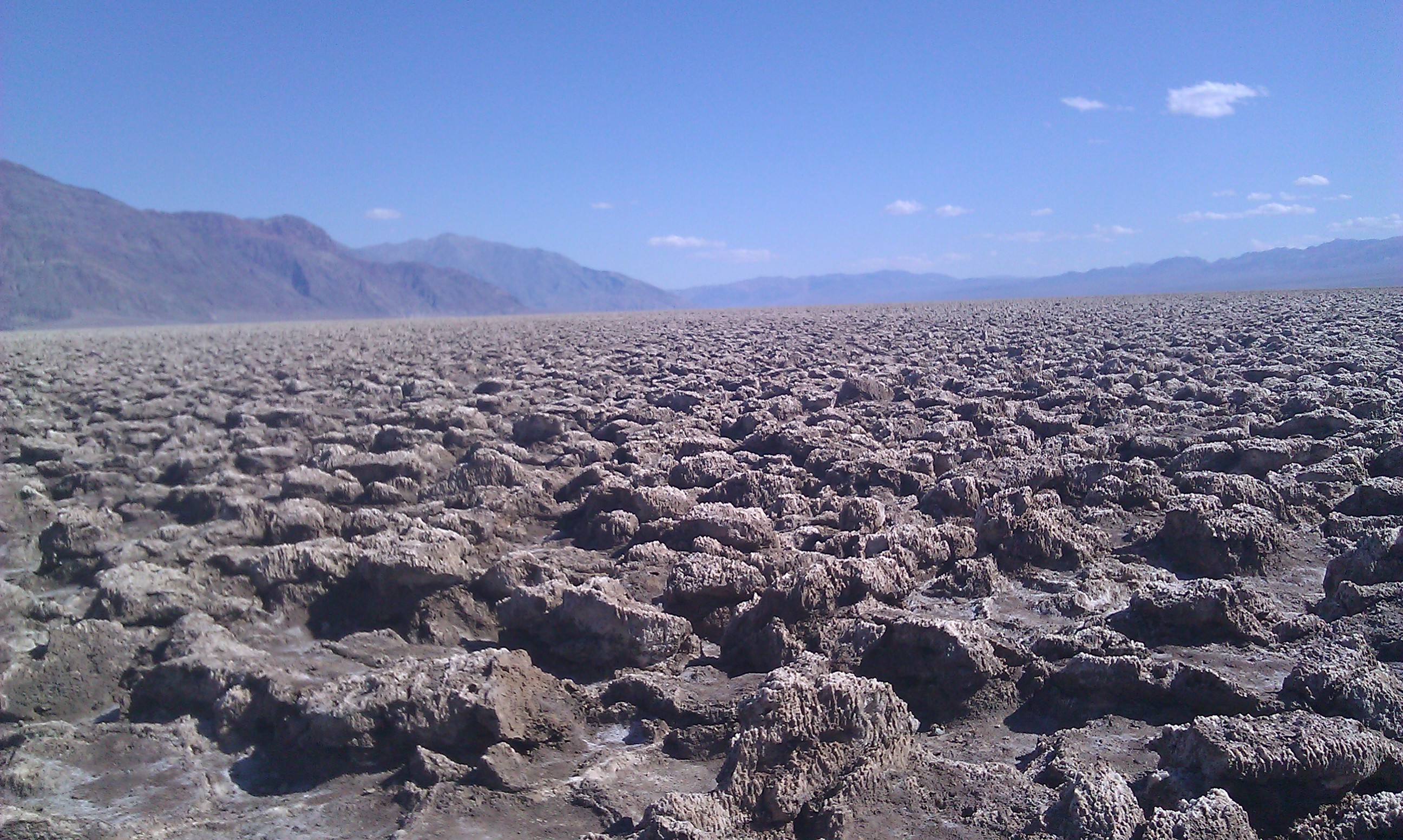 Da wir ohnehin schon spät dran waren und alle einen Bärenhunger hatten, fiel die Wahl für die Frühstücks-Mittagsessen-Kombination auf Wendy’s, die beste Fastfood-Kette in Amerika. Gestärkt und mit einer Menge Wasser vom Walmart gegenüber eingedeckt, konnten wir die Reise Richtung Death Valley antreten. Der erste Stopp auf der Route war Rhyolite, eine Geister-Stadt, die während der Goldgräberzeit aufgebaut wurde und dann schließlich auf Grund der Abwanderung 1919 aufhörte zu existieren. Zu ihrer besten Zeit war dieser Ort die drittgrößte Stadt in Nevada mit über 50 Saloons, mehreren Eisenbahnlinien und drei verschiedenen Zeitungen. Eigentlich hätte ich es mir spektakulärer vorgestellt, aber was solls. Gesehen sollte man es haben. Auf der hügeligen Straße ging es weiter zum „Devil’s Golf Course“, einem weitläufigen Areal weit unter dem Meeresspiegel, wo durch Wind und Wasser lauter kleine, ungefähr 30 Zentimeter hohe Stein-Hügelchen mit scharfen Kanten gebildet werden. Überzogen sind diese Steine alle mit einer leichten Salzschicht.