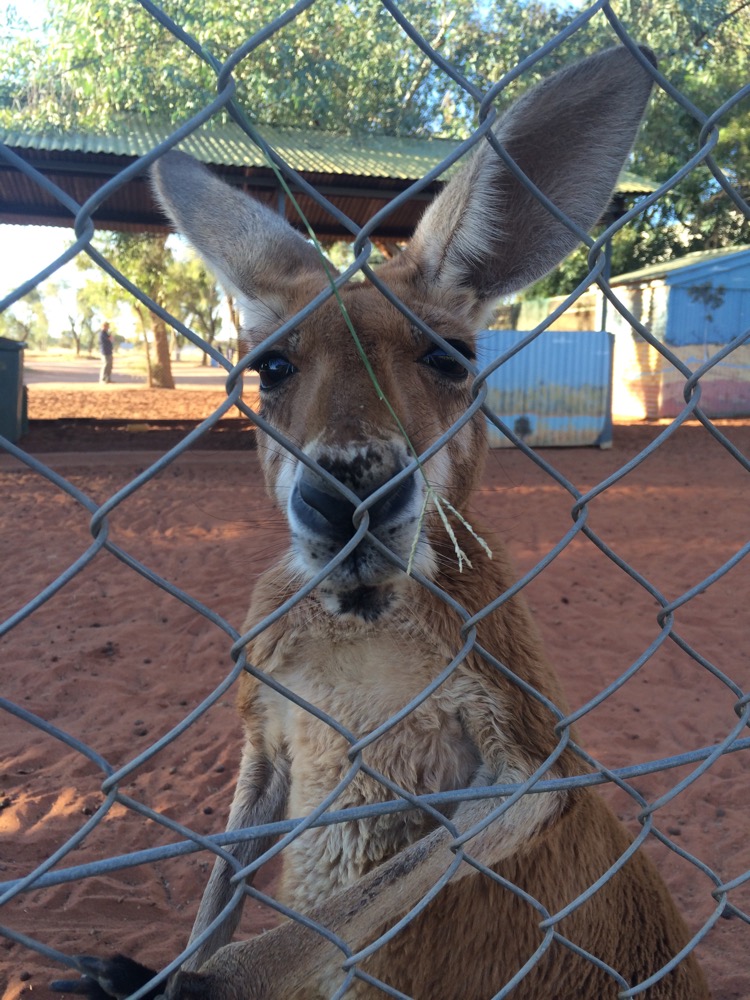 Nach ungefähr einer Stunde Fahrt machten wir den ersten Zwischenstopp bei einer Kamelfarm, wo wir uns nochmals mit Wasser eindeckten und die unterschiedlichen Tiere dort beobachteten. Die Kamele, die hier mittlerweile auch heimisch sind, interessierten uns eher weniger, dafür fütterten wir die neugierigen Kängurus. Auch unseren ersten Dingo haben wir zu Gesicht bekommen. In Australien gibt es übrigens mittlerweile so viele Kamele, dass sie in die Länder, in denen sie eigentlich heimisch waren, zurück exportiert werden, da die Ausmele (australische Kamele! Ur gute Wortschöpfung, oder? ODER??) als sehr robust und stark gelten.