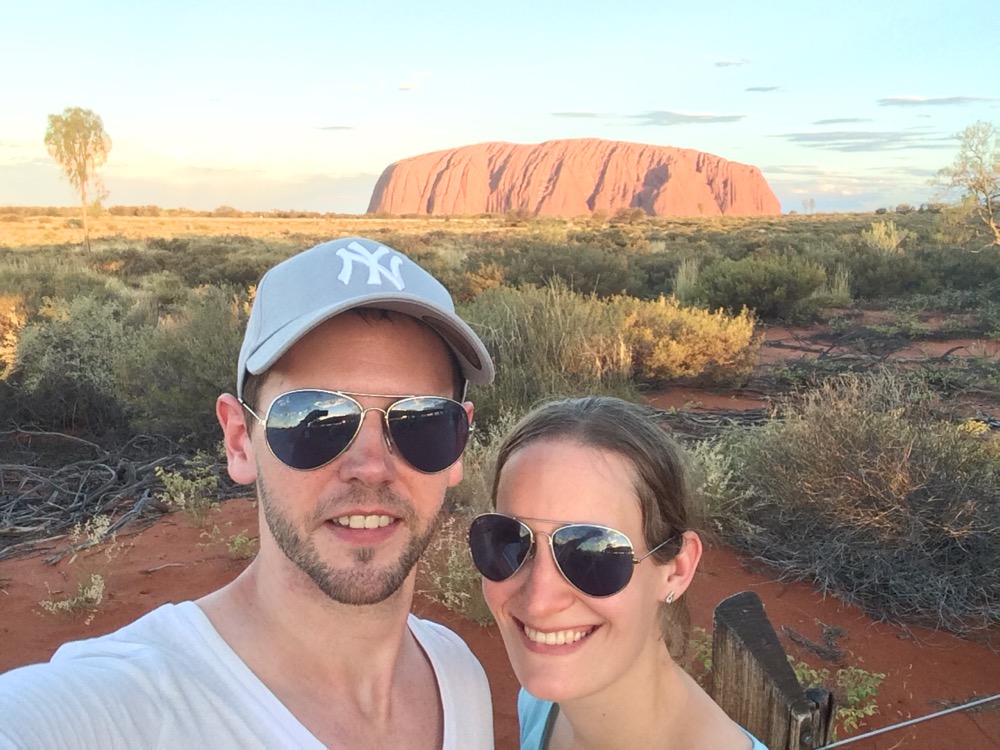Der nächste Stopp war endlich DER Hotspot im Outback, um den Sonnenuntergang zu genießen. wir suchten uns neben den 500 anderen Bussen ein nettes Plätzchen, um einen optimalen Blick auf den Uluru zu haben. Mit einem Tisch und zwei Boxen bewaffnet  gingen wir zu unserem Aussichtspunkt, um auf das Farbenschauspiel zu warten. Versorgt wurden wir mit Cracker, verschiedenen Dips und Champagner. Eben stilecht für Camper. Der Anblick war super, aber ich sage mal so.. Wolken können ziemliche Arschlöcher sein, wenn sie wollen. Denn wie bereits mehrere Male in Key West versauten sie es uns auch hier. Beeindruckend war es aber trotzdem!