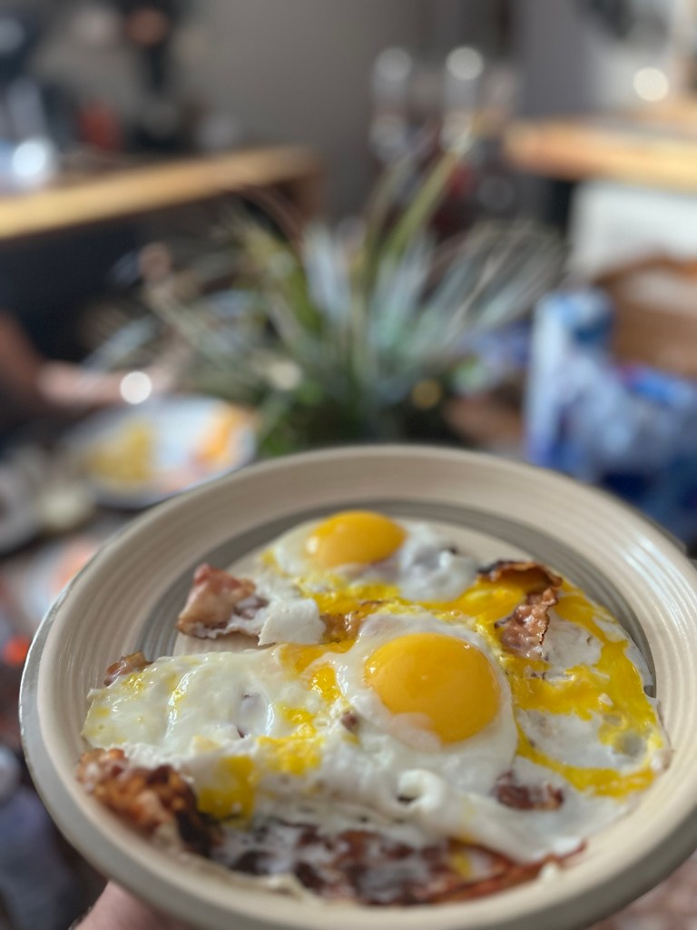 Als ich aufwachte war fürs Frühstück schon alles vorbereitet und ich dachte mir „Hey, wenn’s hier schon eine Pfanne, Speck und Eier gibt, mach ich mir eben ein Champion-Frühstück“, was mit der Pfanne, die aufgrund ihrer Ausbeulungen eher ein Wok war, herausfordernd, führte aber doch zum Ziel.