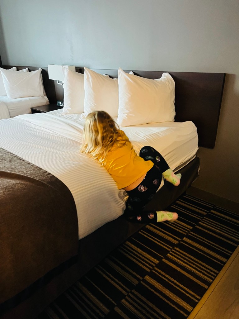 Wieder unten angekommen wurden die Kids magisch von einer Trampolinanlage angezogen und nach ein wenig Diskutieren haben wir es ihnen erlaubt zu springen, also wollte ich die Tickets holen. Ganz so einfach war das aber nicht, denn man musste zusätzlich vorher einen Zeitslot buchen und der nächste freie war erst in über einer Stunde. Uns Erwachsenen war das zu lang, den Kindern natürlich nicht. Kurzform des Folgenden: Enttäuschung, Tränen, Drama, Eltern werden erweicht, kaufen also trotzdem Tickets, weil die zwei Hexen tatsächlich unglaublich brav sind, wenn’s um lange Autofahren geht. Kurze Randnotiz: Aufgrund eines kleinen Unfällchens bei der ersten Fahrt gibt es übrigens kein Tablet mehr beim Autofahren, also fällt die geplante Ruhigstellung damit aus und sie müssen sich selbst eine Beschäftigung suchen.