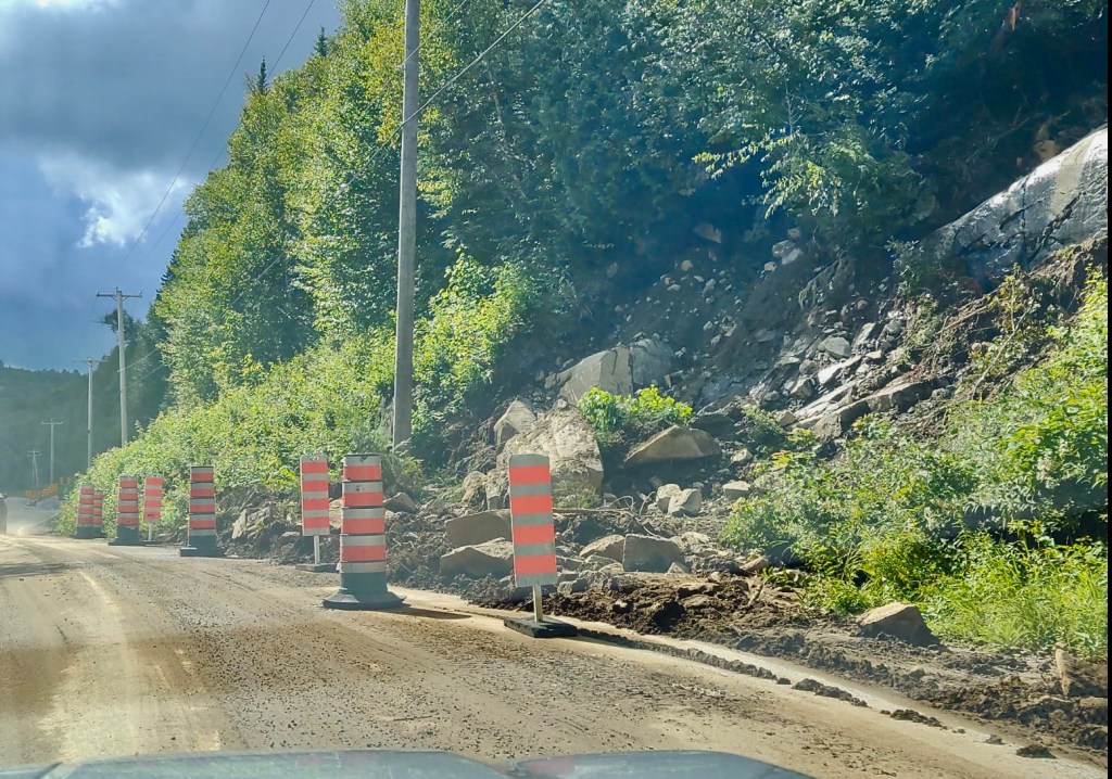 Leider machte uns eine weitere Straßensperre einen Strich durch die Rechnung, heute weniger als drei Stunden fahren zu müssen. Unterwegs bremste das Auto vor uns plötzlich ohne ersichtlichen Grund ab. Ich hoffte ja auf eine Bärensichtung. Oder was anderes spannendes. Vielleicht hatte er auch ein Streifenhörnchen überfahren und wollte es uns zeigen? Vielleicht wurde wieder ein Streifenhörnchen zum steifen Hörnchen? Der ältere Herr stieg aus, kam zu uns und erzählte uns auf Französisch irgendwas. Erst nach seinem ersten Redeschwall konnten wir ihm sagen, dass wir nur Englisch sprächen und er versuchte zu erklären, dass die Straße ein Stück weiter gesperrt wäre. Mal wieder.