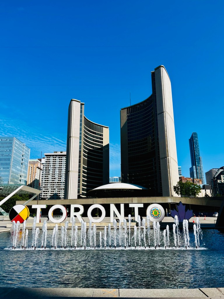 Zum ersten Mal seit langem hatten wir keinen Wecker gestellt und somit bis ungefähr acht geschlafen. Wir hatten keinen richtigen Plan, doch ein Bild im Hotelzimmer half uns bei der Entscheidungsfindung. So spazierten wir den knappen Kilometer zum Rathaus, um den nachts bunt beleuchteten Toronto Schriftzug zu besuchen.