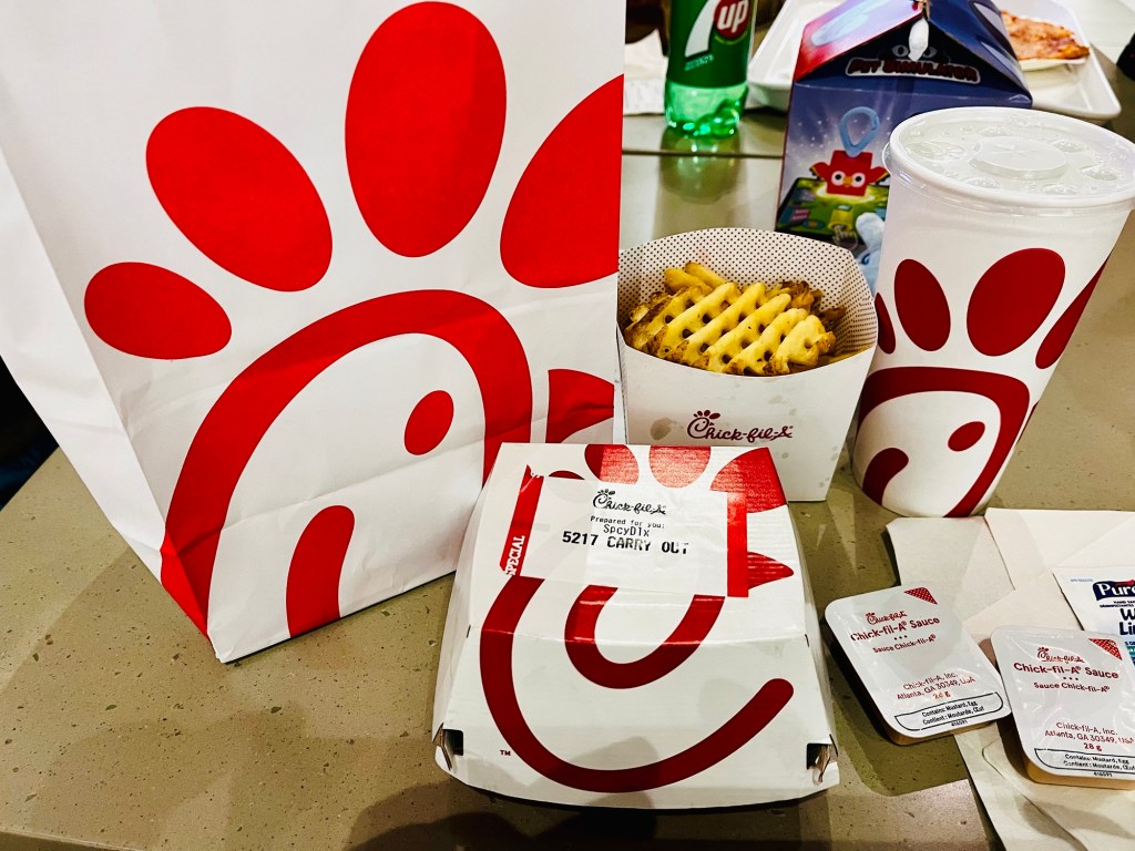 Fürs Mittagessen nutzten wir die Vielseitigkeit des Food Courts im Untergeschoss und so konnte sich jeder das holen, worauf er Lust hatte. Julia nahm Pizza von Sbarro, Emilia ein Happy Meal von McDonald’s, Anita ein Gyros Pita von Jimmy the Greek und ich holte mir Spicy Chicken von Chick-fil-A. Kerstin wollte sich den Hunger für später aufheben, da sie noch einen Plan verfolgte.