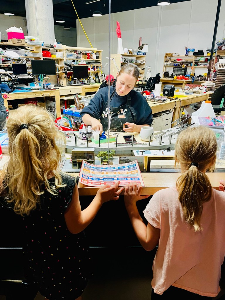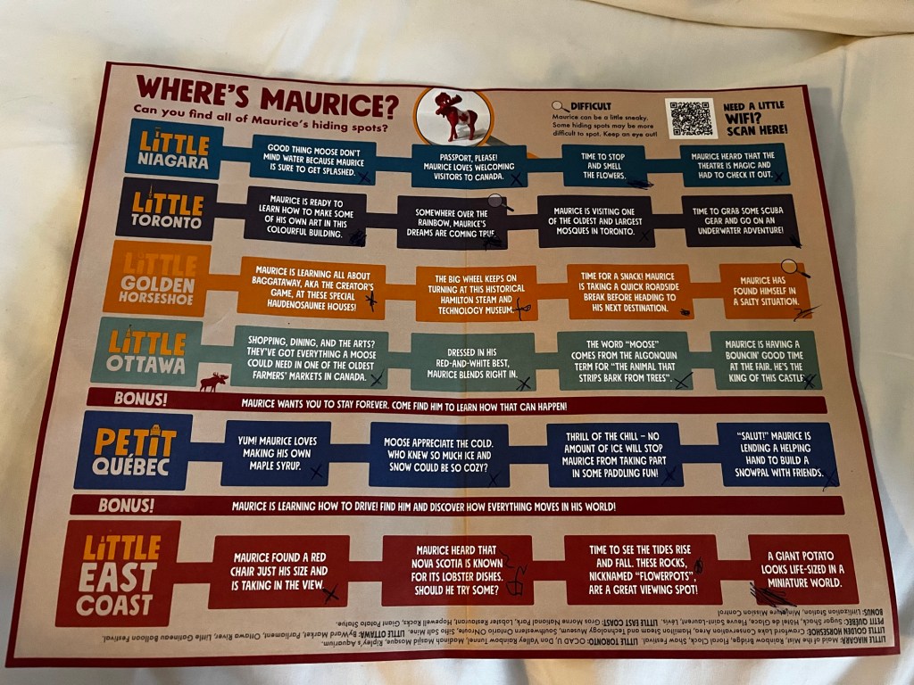 Für die Kids gab es in jedem der sechs Bereiche (Little Niagara, Little Toronto, Little Golden Horseshoe, Little Ottawa, Petit Quebec und Little East Coast) viermal Maurice, the Moose, einen rot-weiß-roten Elch zu entdecken. Mit unseren Adleraugen konnten wir alle 24 Maurices finden und uns somit einen Sticker im Giftshop gesichert. Die nette Dame an der Kassa fragte die Mädels, ob sie denn einen schönen Tag gehabt hätten. Als wir übersetzten, sagte sie „Oh, ihr sprecht Deutsch?“ und so plauderten wir ein bisschen mit ihr. Sie erzählte, dass sie vor acht Jahren von Bochum nach Kanada ausgewandert sei, ihre Eltern sie immer schief anschauen würden, wenn sie mal wieder Deutsch mit Englisch vermischte und noch ein paar andere Dinge.