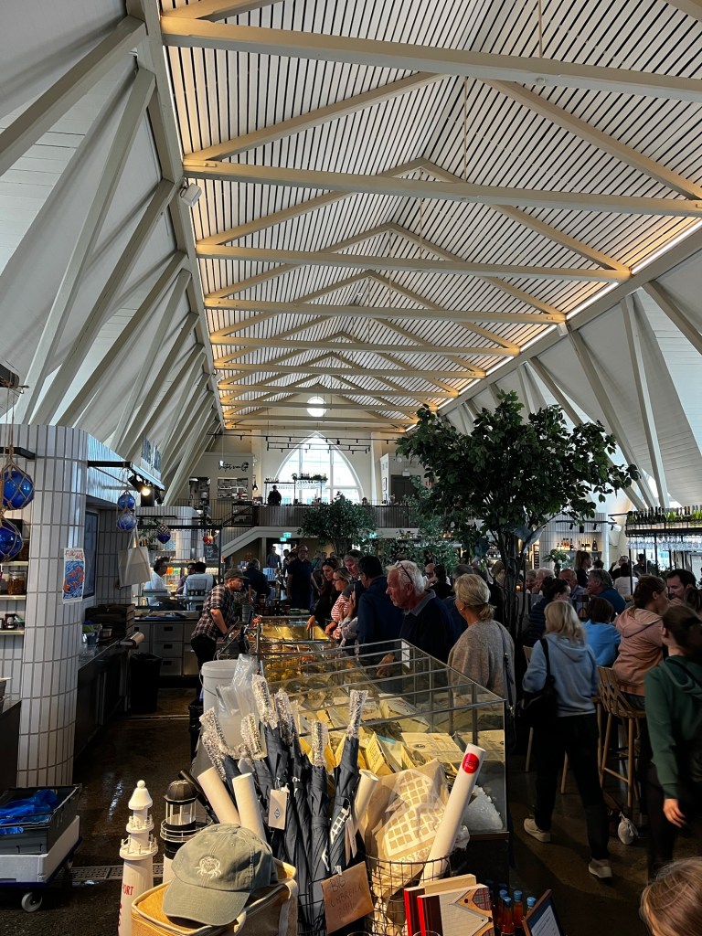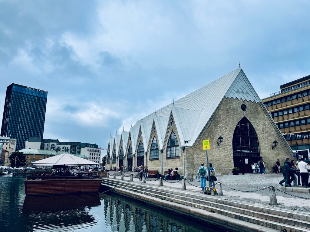 Da wir einen alternativen Rückweg nahmen, um nicht immer dieselben Straßen entlang zu laufen, und der Regen schnell wieder verschwand, kamen wir an der Fischkirche vorbei, die wir gestern schon vom Boot aus sahen. Wir betraten die Kirche (die in Wirklichkeit eine Handvoll Fischhändler beherbergt und in der Mitte zahlreichen Gästen Platz bietet, die frischen Fische mit einem Glas Wein hinunterzuspülen) und ich überlegte, ob ich eine Dose des berühmt-berüchtigten Surströmmings mitnehmen sollte. Noch hab ich mich nicht getraut, primär aus Angst, dass die Dose mit dem gärenden und äußerst übel riechenden Herings im Flugzeug explodieren könnte und ich somit den gesamten Inhalt des Koffers gleich direkt in Wien Schwechat entsorgen müsste.